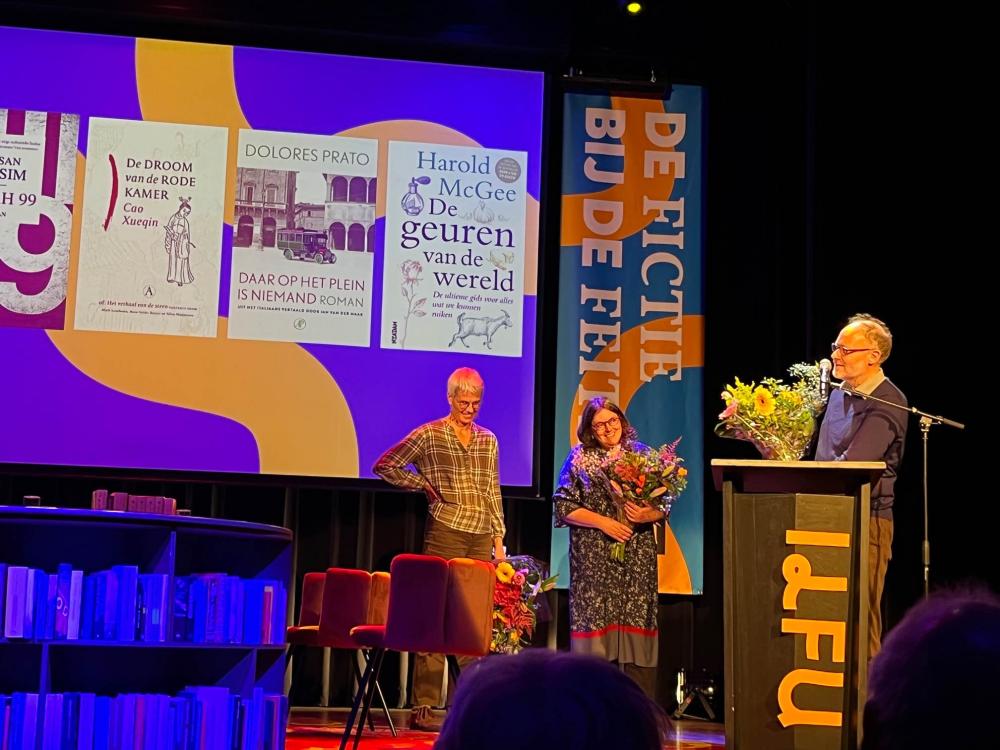 Foto van de drie vertalers met bloemen op het podium tijdens de uitreiking.